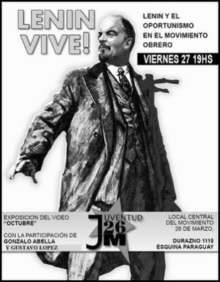 El pasado 21 de enero se cumplieron 88 años de la desaparición física del camarada Vladimir Ilich Uliánov conocido mundialmente como Lenin. La Juventud del 26 en esta oportunidad se propone elevar el inmenso legado teórico y práctico trayéndolo a la actualidad y sobre todas las cosas demostrar que la vigencia de su pensamiento y de su praxis está intacta y latente en todos los revolucionarios. No pretendemos con esta Campaña “Lenin Vive” saturar de frases célebres o atiborrar de reflexiones románticas evocando las instancias del glorioso Octubre de 1917 aisladas en el tiempo o con ideas abstractas despegadas totalmente (y adrede) del presente proceso uruguayo. Queremos rescatar al revolucionario cabal, rescatar al propulsor y ejecutor de la primera revolución socialista del mundo que modificaría la historia de la humanidad para siempre pero con las extremidades inferiores bien afirmadas en lo contemporáneo. Y recordar fundamentalmente que la vigencia de Lenin crece y se desarrolla, cada vez tiene más validez y más vigor, porque el leninismo como ciencia tiene una respuesta para todos los problemas de la humanidad.