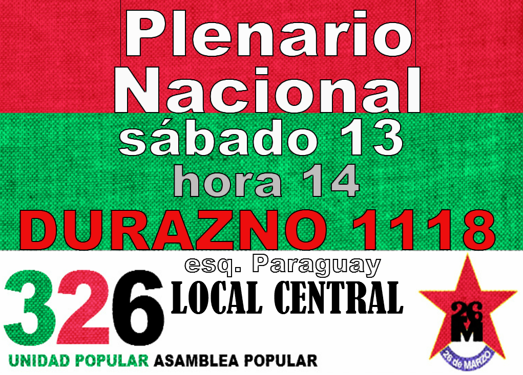 «El Plenario Nacional del 26M está convocando para este sábado 13 de diciembre, a partir de las 14 horas en nuestro local central de Durazno 1118 esquina Paraguay. Allí estaremos para celebrar, recibiendo a los compañeros del país que ya nos han ido confirmando la presencia», dijo Gonzalo Martínez, responsable de la Juventd del 26M e integrante de la comisión organizadora.El Plenario tendrá una parte política, donde la Dirección Nacional del 26M realizará un informe y balance del año, y fundamentalmente del resultado electoral. Luego habrá una parte de celebración de despedida del año tan merecida y tan necesaria que tiene el 26 de Marzo, porque este es un año especial, en que nuestra lucha se vio coronada con el ingreso al Parlamento: «hay una cuestión de percepción en función de los resultados que se van obteniendo, a veces uno cree que los resultados deben ser inmediatos pero no es así, en la medida que uno hace un proceso de acumulación, que es lento, que es costoso. Entonces, se puede ver que el 26 de Marzo siempre estuvo en el camino correcto. Si nos referimos, por ejemplo, a esta victoria concreta que fue la conquista de la representación parlamentaria, este trabajo, nadie lo puede creeer que lo hayamos conquistado y obtenido en estos meses de campaña electoral. Todo lo contario, este diputado, nosotros lo venimos conquistando desde que nos fuimos del Frente Amplio; desde que la Asamblea Popular se constituyó; que estuvimos en las primeras elecciones y no llegamos cono los votos», subrayó Gonzalo.