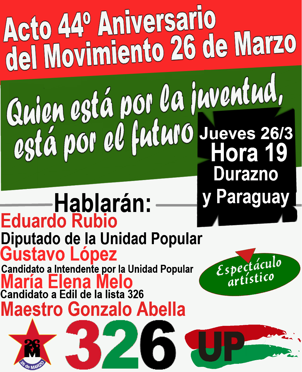 “Compañeras y compañeros, 44 años de vida de esta organización política. Para algunos de nosotros son también 44 años de militancia en esta organización. Yo creo que no puede haber alegría más grande para una organización que ha sobrepasado como los hermanos de la Unidad Popular, las más grandes dificultades, que hemos enfrentado la intemperie, que nos fuimos del poder para seguir siendo coherentes, que hemos enfrentado la mentira y la calumnia, que nos decretaron la muerte reiteradas veces, llegar a festejar 44 años con esta consigna: “Quien está por la juventud está por el futuro”. Y nosotros decimos que en el 26 de Marzo como en la Unidad Popular, lo dijo María Elena, la juventud no es una promesa de futuro, son los constructores de este presente, están en la vanguardia del trabajo político, del trabajo de propaganda y del trabajo económico. No hay mayor orgullo y alegría para una organización contar con jóvenes que se comprometen con la lucha por idealismo, no esperando el beneficio de ningún cargo porque acá el único cargo que encuentran los jóvenes y cualquier militante que venga es el del trabajo, militancia, compromiso y tranquilidad de consciencia que es lo más importante. Nosotros, en cada aniversario sentimos la obligación, el compromiso de recordar a los mejores, a aquellos que dejaron su vida en la construcción de esta organización, en la lucha de nuestro pueblo, en la perspectiva de construir una sociedad justa, de iguales, libre, una sociedad socialista»