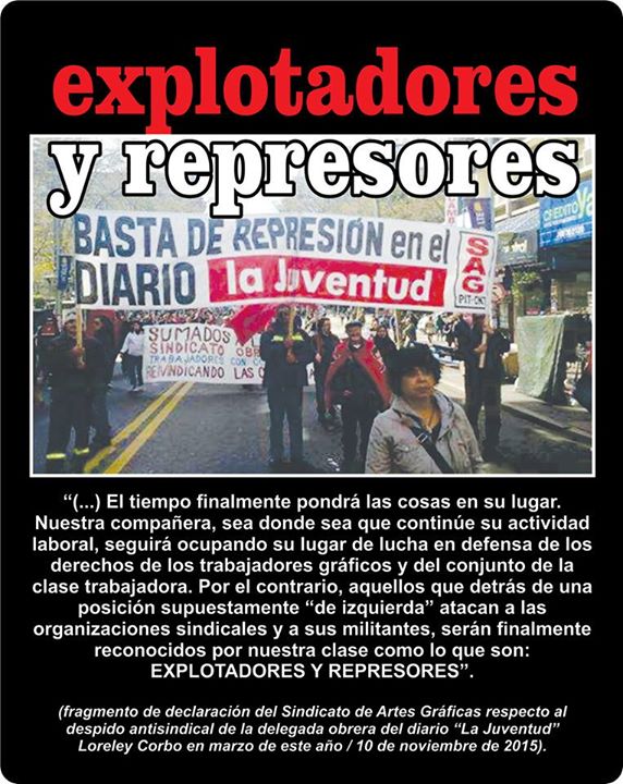 Hace poco fracasó la cooperativa Pressur, de Nueva helvecia, que también envió algunos de sus representantes a escracharnos en la primera vez. En el 2013 la cooperativa había recibido 6 millones de dólares del Fondo de Desarrollo (Fondes). El Banco República informó a la cooperativa que explotaba la Imprenta, que remataría la maquinaria para cobrar al menos en parte la deuda de 18 millones contraída con el Banco estatal.