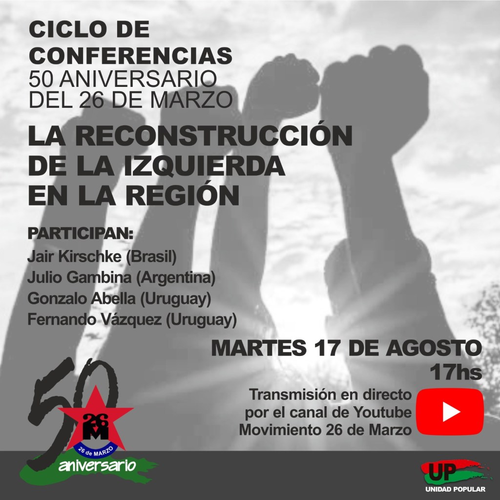 El Movimiento 26 de Marzo realiza finalmente este martes 17 de agosto de 2021 su 2a. Conferencia del Ciclo por el año del 50 Aniversario de esta organización, integrante de Unidad Popular. En esta oportunidad el tema será «La reconstrucción de la izquierda en la región». Participarán el economista marxista e investigador Julio Gambina de Argentina, el presidente de la Movimiento de Justicia y Derechos Humanos Jair Krischke de Brasil, el maestro y escritor Gonalo Abella y el integrante de la Dirección nacional del 26M Fernando Vázquez. Se pueden enviar preguntas y comentarios al celular del 26 de Marzo (598) 99 326 326, al correo prensa26deMarzo@gmail.com, o hacerlas en el chat de nuestro canal durante la transmisión.